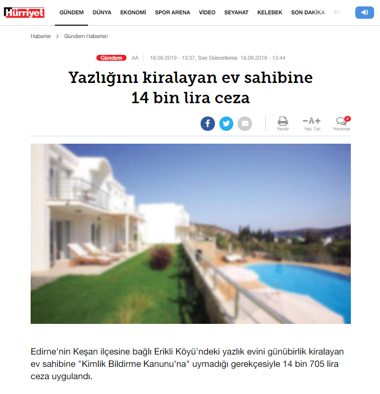 Edirne'nin Keşan ilçesine bağlı Erikli Köyü'ndeki yazlık evini günübirlik kiralayan ev sahibine "Kimlik Bildirme Kanunu'na" uymadığı gerekçesiyle 14 bin 705 lira ceza uygulandı.